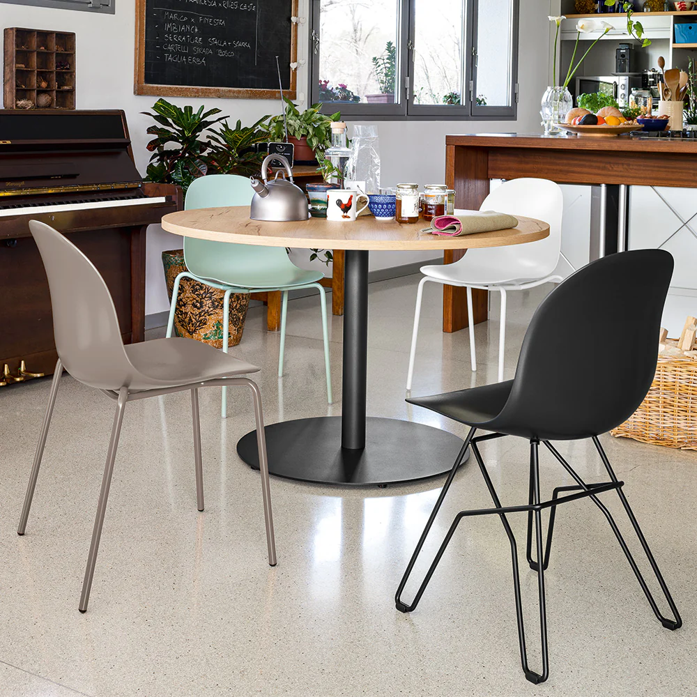 Sedia modello ACADEMY. La forma della seduta rappresenta una ricerca alle forme semplici e sinuose adatte ad ogni ambiente e situazione. il fusto a 4 gambe è in tubo di metallo. La varietà di scelta di abbinamento tra fusti e sedili di questo modello consente di offrire molte alternative per soddisfare qualunque esigenza estetica e funzionale.