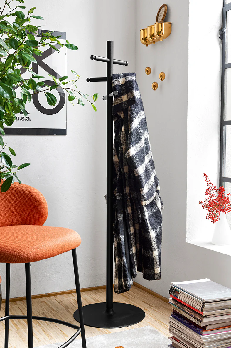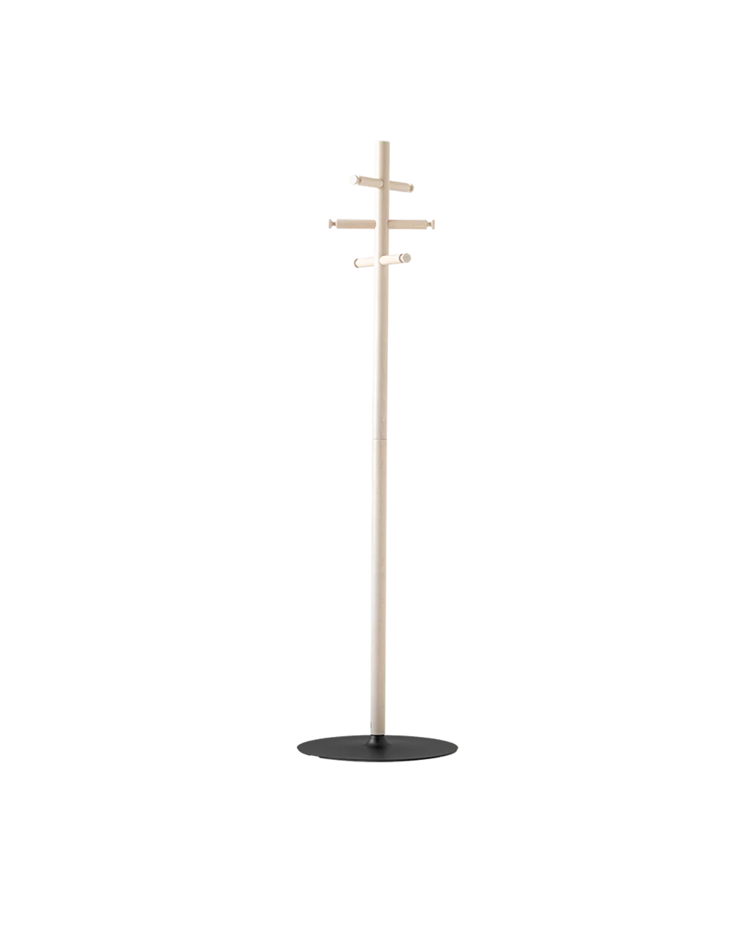 Appendiabiti con base zavorrata, colonna in metallo e ganci in legno di faggio.