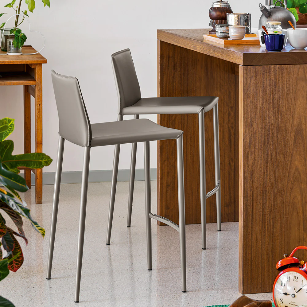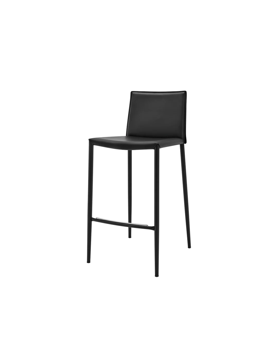 Sgabello modello BOHEME, struttura in metallo con poggiaspiedi e sedile schienale rivestiti in cuoio rigenerato.Sedile e schienale sono rivestiti in cuoio rigenerato – un materiale composto da pelle e altre fibre naturali e rifinito come il cuoio – mentre le gambe a sezione conica sono in tubolare di acciaio. La cura progettuale delle linee si denota anche nella coerenza cromatica tra la struttura e la seduta sagomata. Le cucitura a vista impreziosiscono ulteriormente la sedia.La consigliamo per completare la penisola in cucina oppure in un lounge bar. Scegli la configurazione che preferisci.