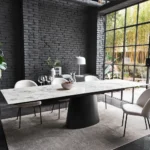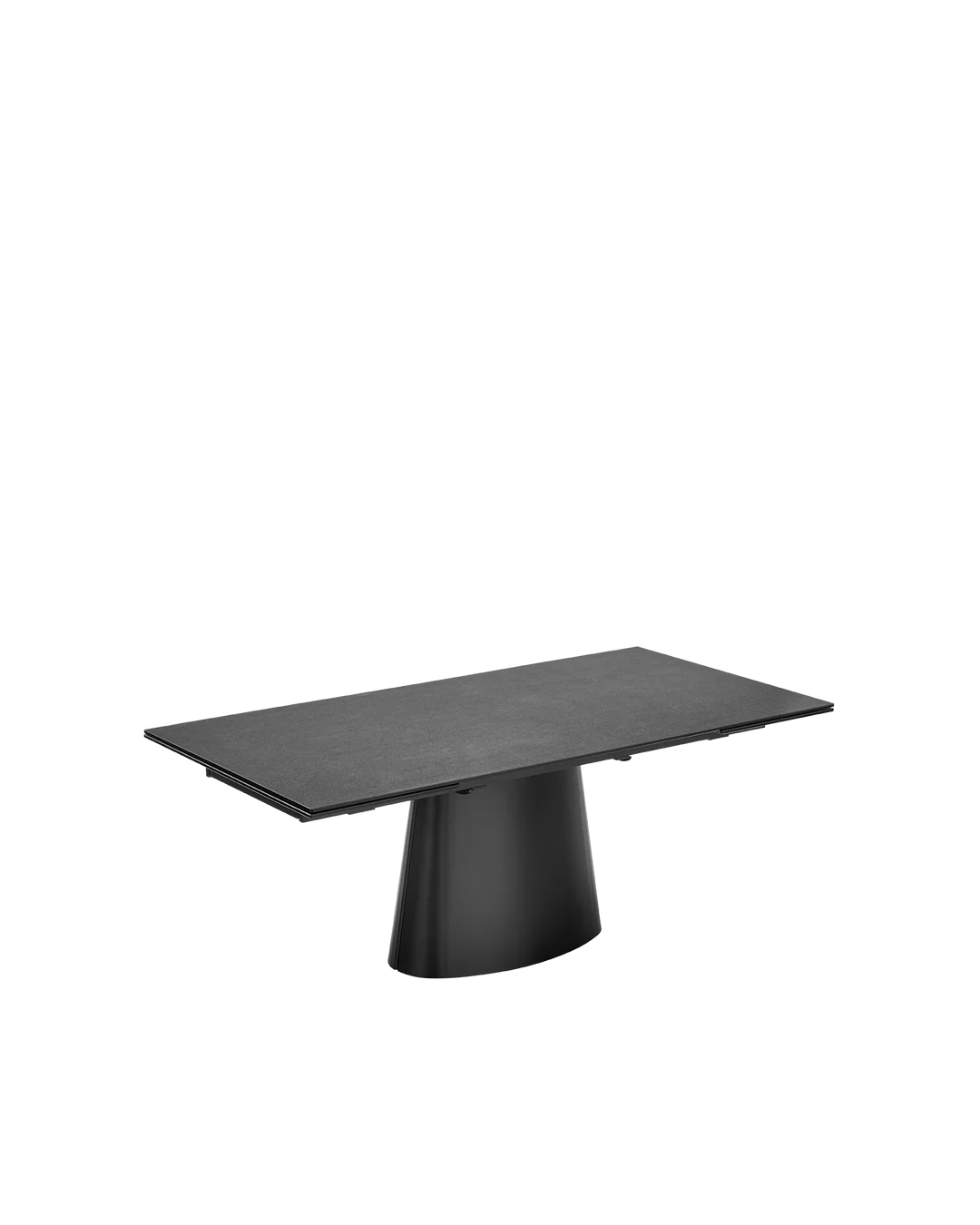 Design monolitico ed essenziale risulta elegante in ogni ambiente e perfetto per ogni tipo di arredamento. Ellisse è un tavolo allungabile con piani in ceramica ed una base monolitica in lamiera curvata verniciata.