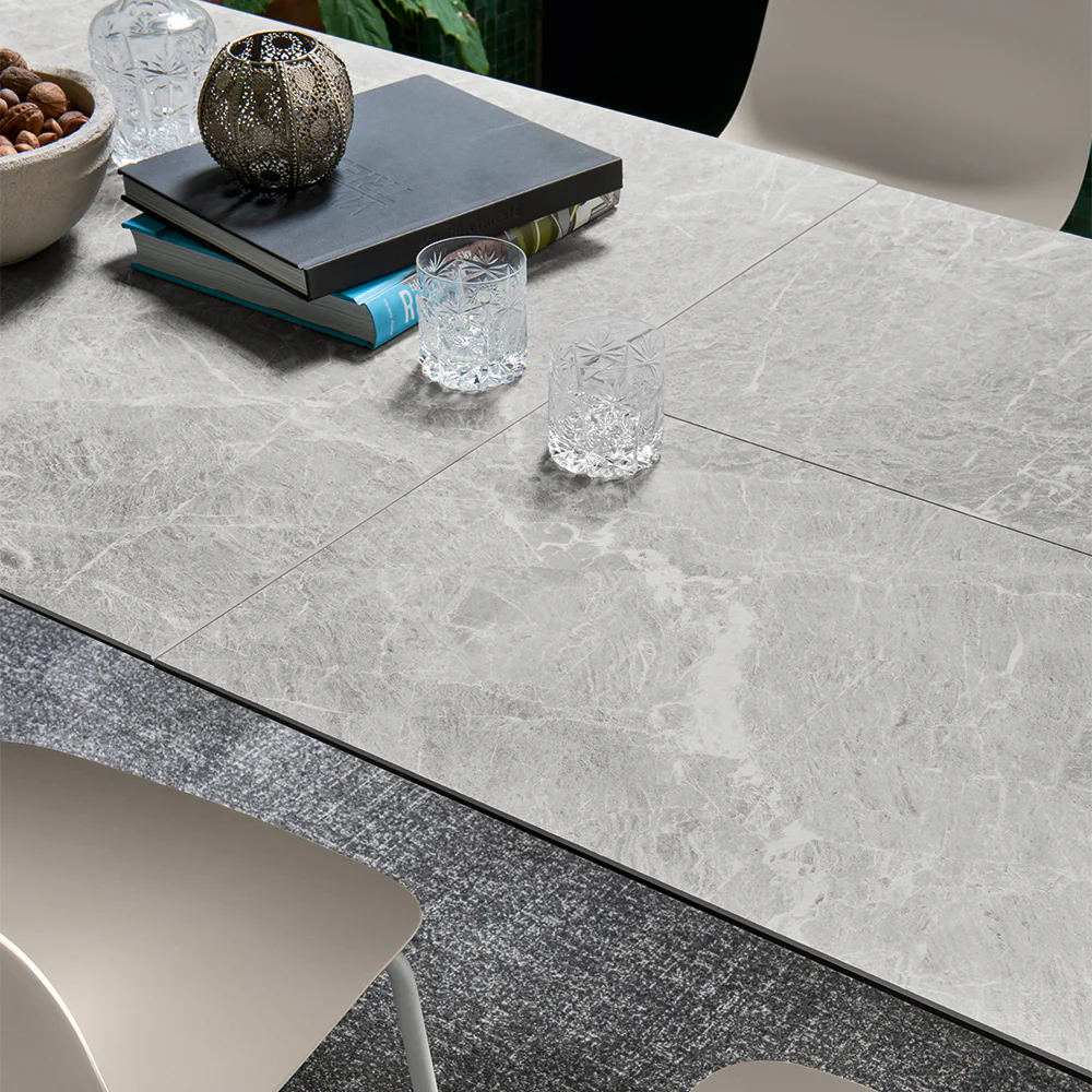 La sua capacità di estendersi tramite la sua prolunga a libro permette di adattare facilmente le dimensioni del tavolo in base alle diverse esigenze. Le gambe in metallo restano sempre perimetrali per garantire il comfort di tutti gli ospiti.