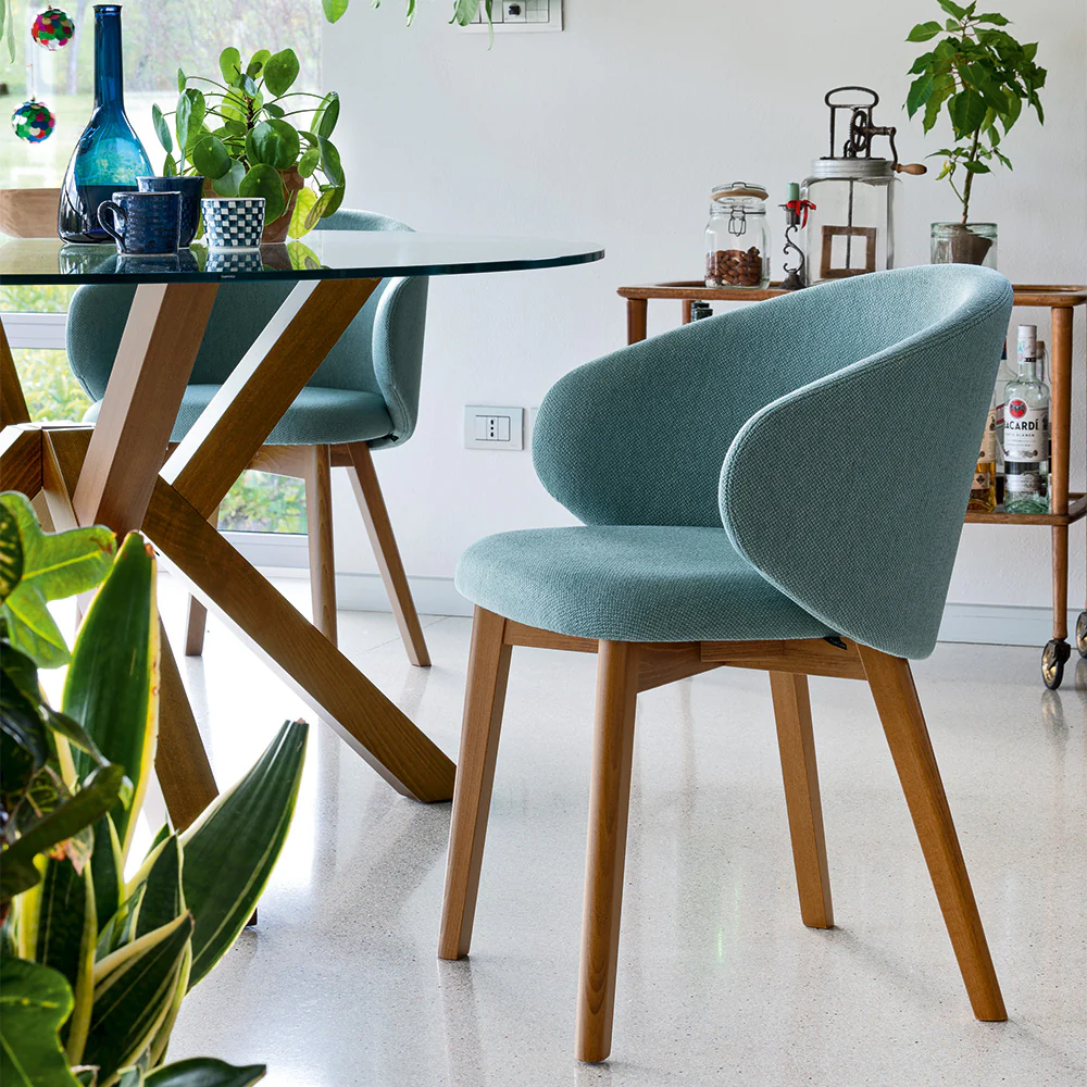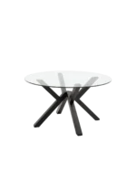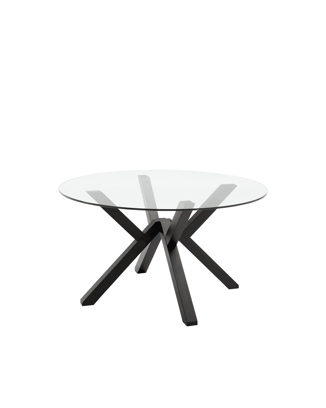 Tavolo rotondo MIKADO con piano in vetro temprato. La caratteristica principale di questo tavolo è il design del basamento in legno di faggio. Grazie al piano rotondo la comodità è sempre garantita per tutti i commensali… anche quando sono in numero dispari!