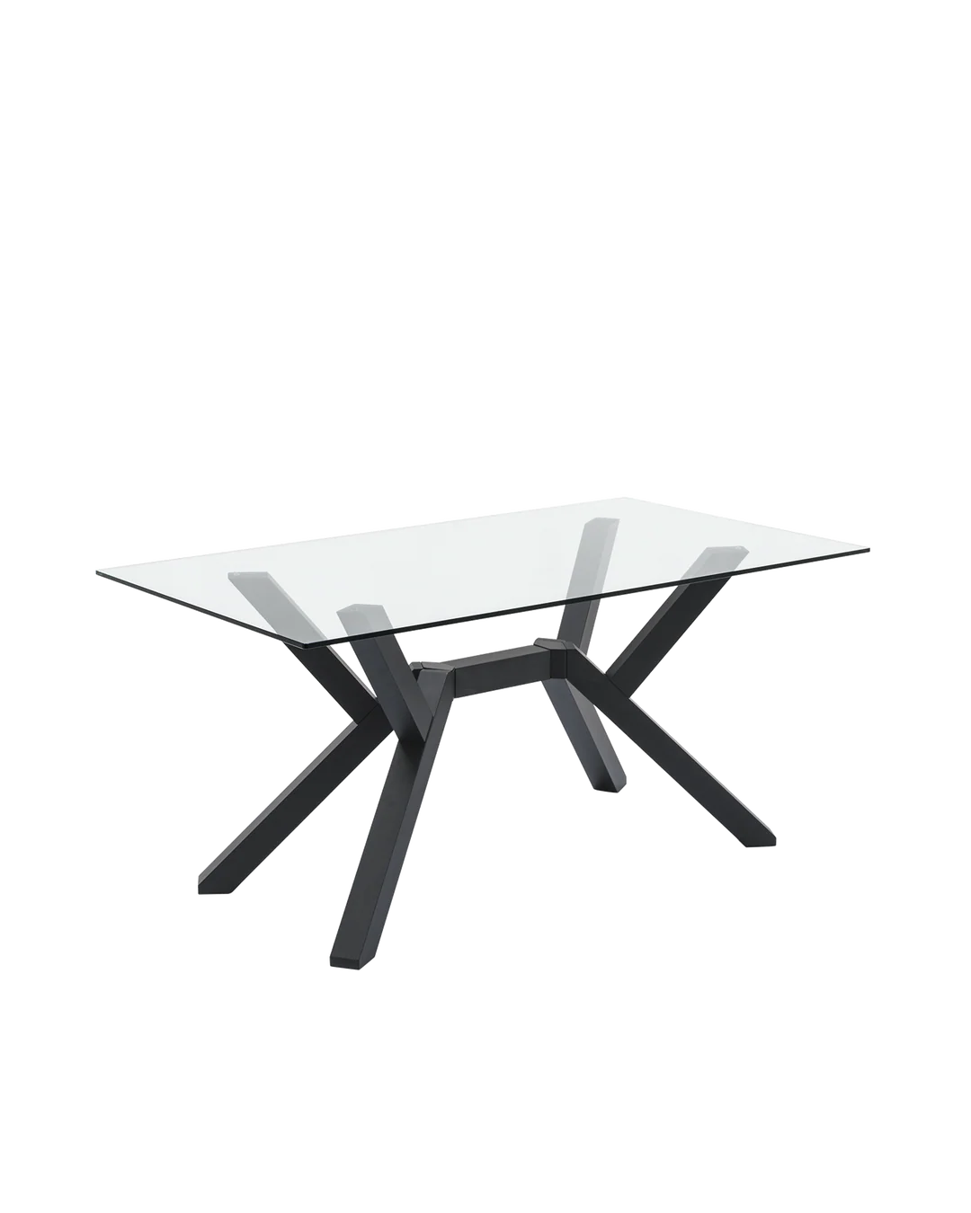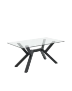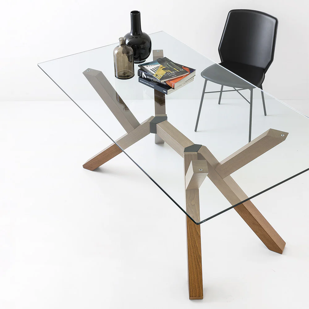 MIKADO è un tavolo rettangolare fisso con piano in vetro temprato e struttura e gambe in legno di faggio. La caratteristica principale di questo tavolo è il design del basamento, con i cavalletti che vengono uniti da un elemento in metallo verniciato nero.