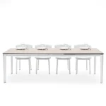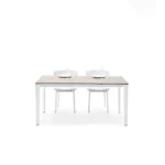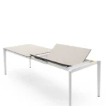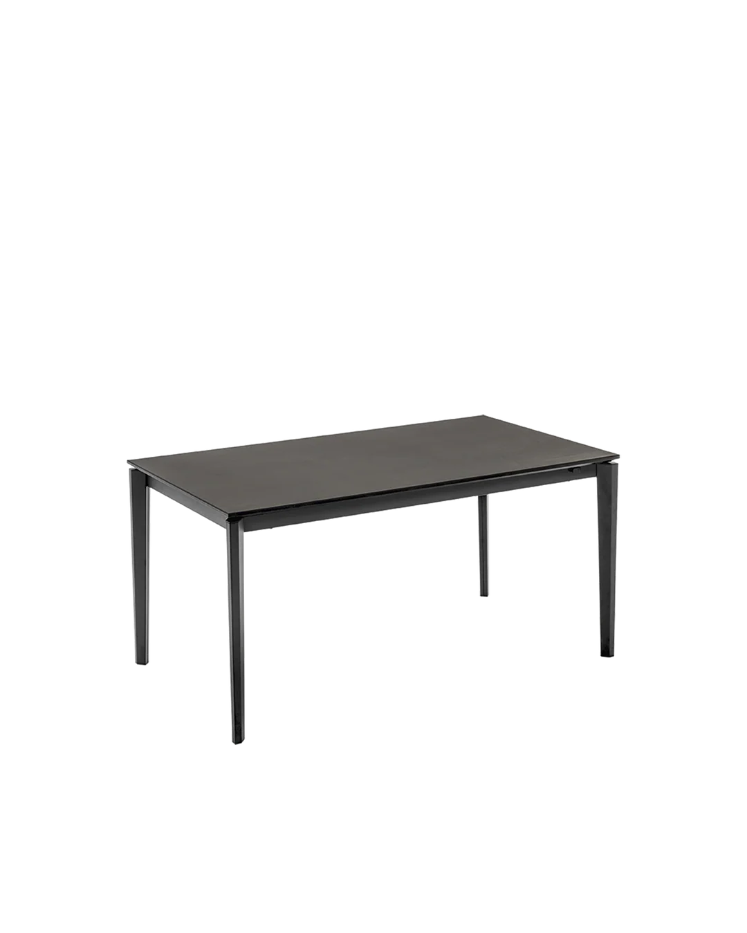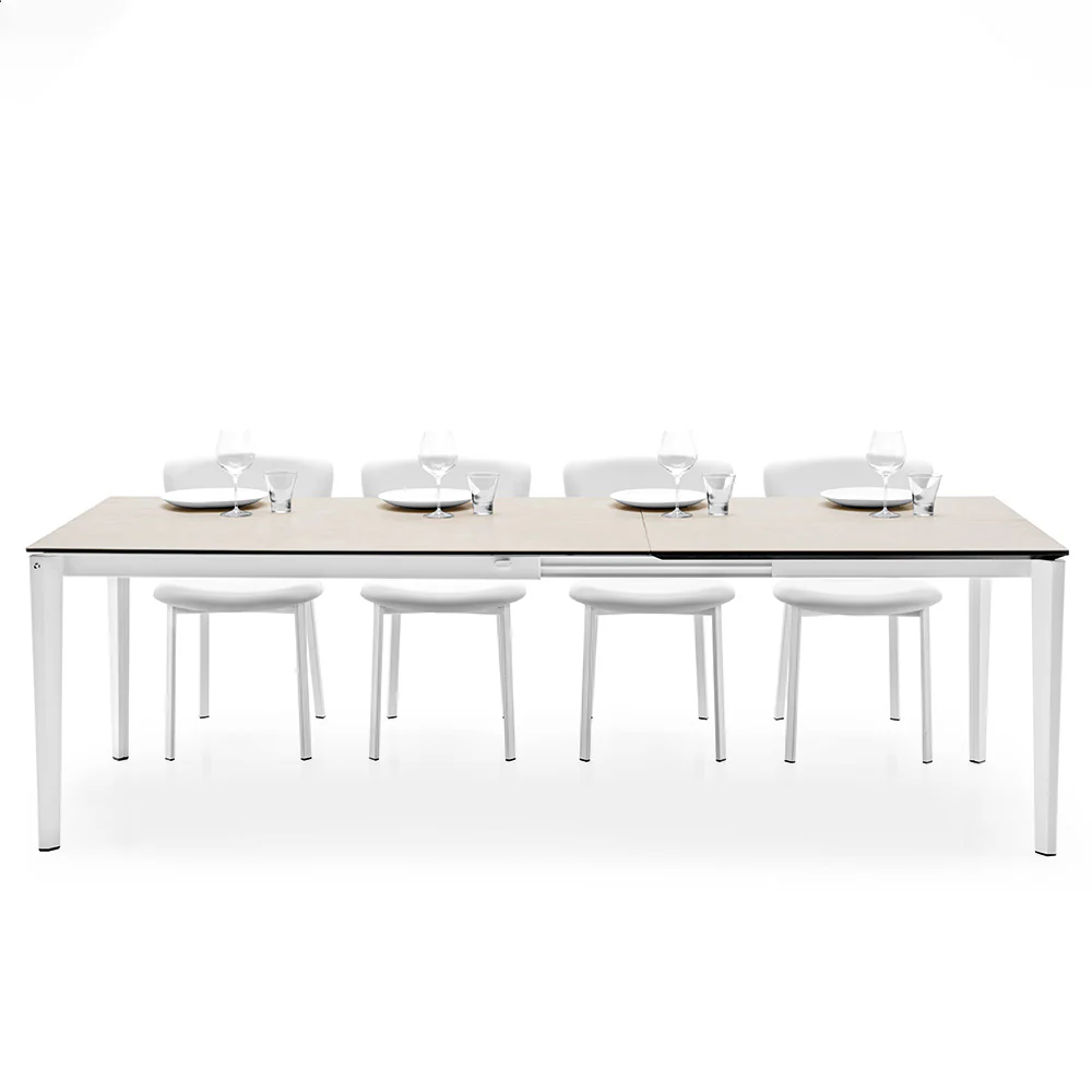 Tavolo allungabile con basamento in metallo. La caratteristica di questo modello è la gamba a forma pentagonale conica, da cui il nome.Questa base può essere abbinata a piani in ceramica, per adattarsi ad ogni esigenza di spazio e di stile. Il sistema di allunga di Pentagon Fast prevede un’allunga laterale a libro nella stessa finitura del piano e gambe sempre perimetrali, con utilizzo di ruote in gomma morbida posizionate sotto alle gambe che si spostano.