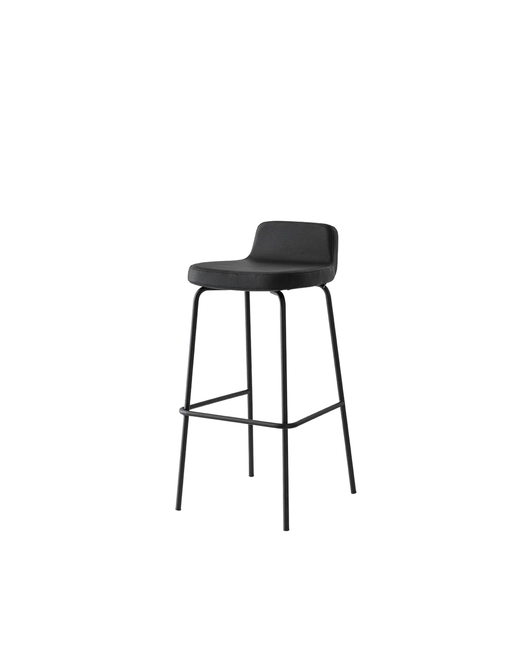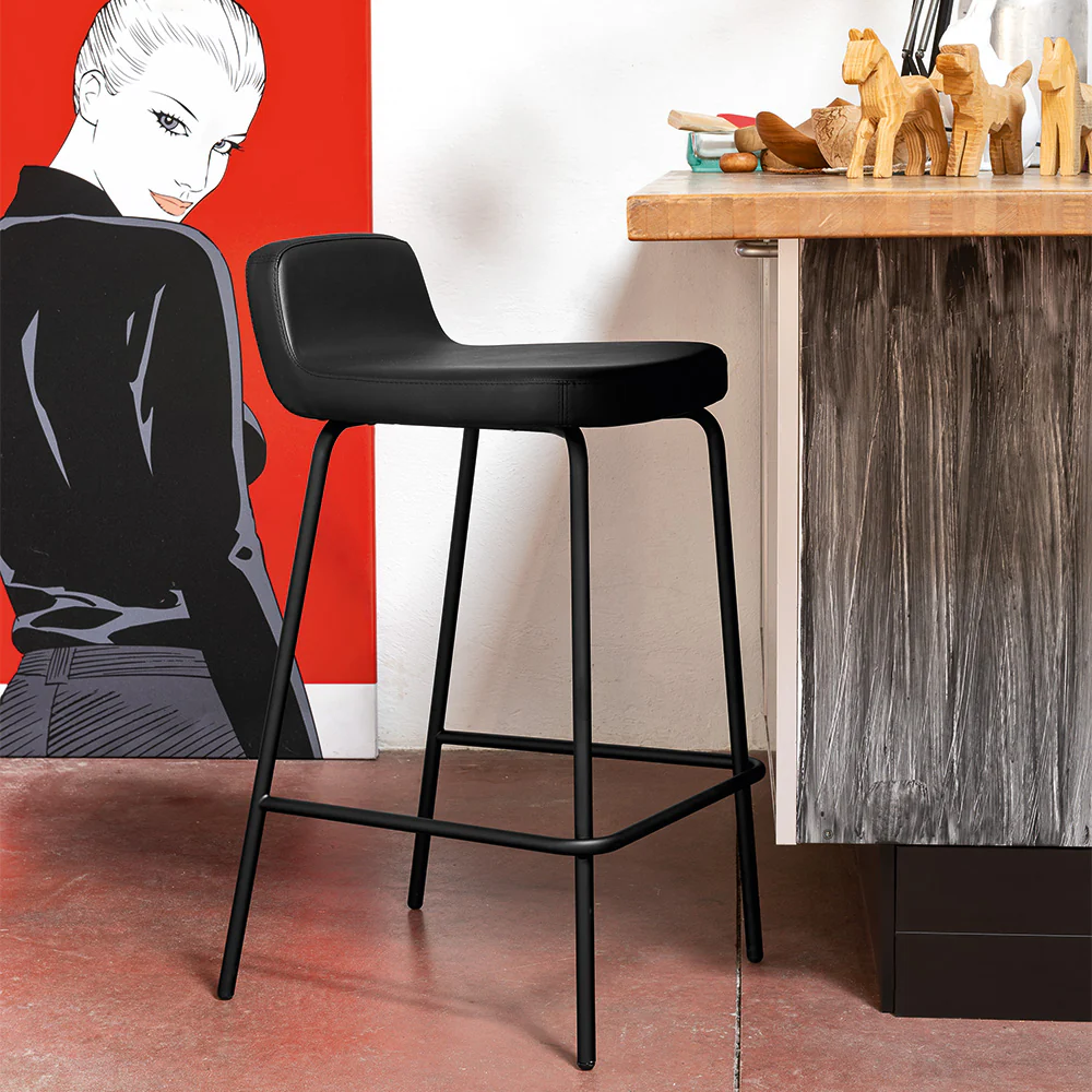 Sgabello RILEY con base in tondino di metallo. Sedute a scelta fra diversi materiali e finiture.