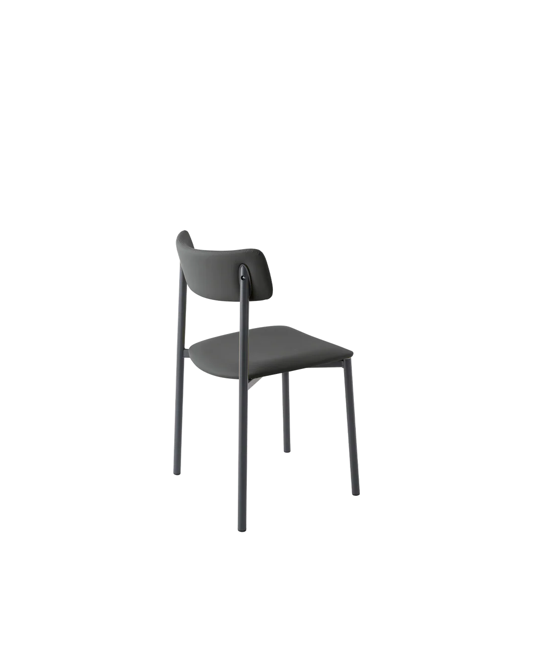UP! รจ una sedia con struttura in metallo e sedile realizzato con coppie in multistrati imbottite e tappezzate fisse in simil pelle. Lo schienale viene fissato tramite vite di fissaggio posteriore nascosta con un tappino in materiale plastico, in tinta con il fusto.