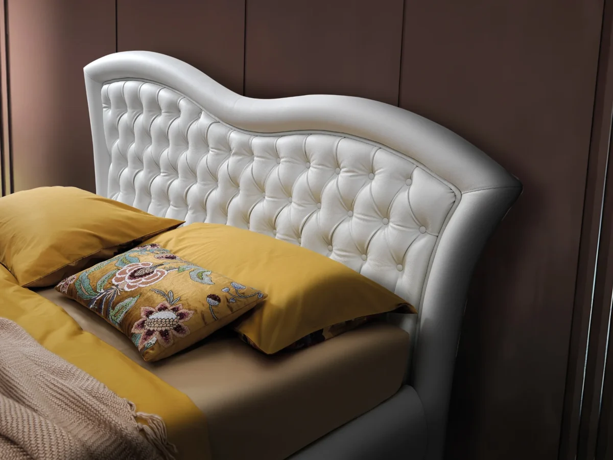 È un modello pregiato, contraddistinto dalla lavorazione a capitonnè sull’inserto centrale della testiera, eseguito da maestri tappezzieri, espressione della rinomata artigianalità locale.